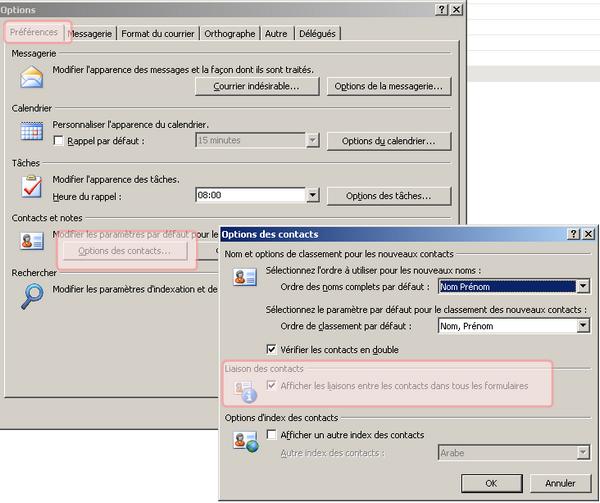 Dans Outlook 2003, le champs Contact était présent en pied du formulaire journal, par exemple, ce qui permettait d'affecter l'entrée à un ou plusieurs contact(s) présent dans le carnet d'adresse. Cette fonctionnalité est aussi utilisée dans le cadre de plugin qui permettre d'enregistrer automatiquement les appels téléphoniques (Procall de Estos, etc.). Dans Outlook 2007, cette fonctionnalité n'est pas présente par défaut - on se demande bien pourquoi d'ailleurs - et voici comment l'activer Menu Outils > Options... > Options des contacts... > puis mettre le tickle dans "afficher les liaisons entre les contacts dans tous les formulaires". |
