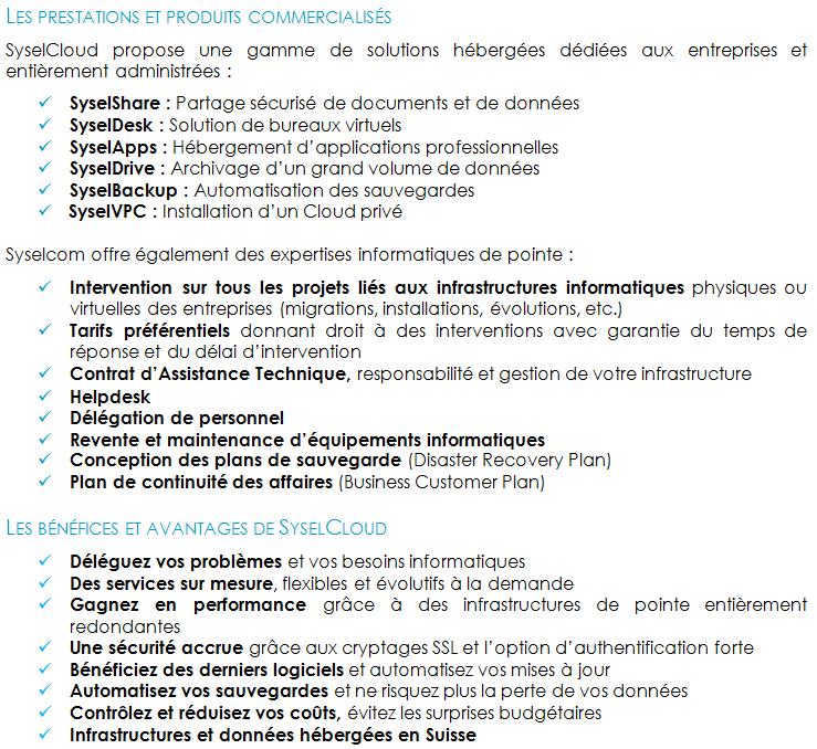 complète de solutions Cloud Computing 100% suisses : SyselCloud. Ces