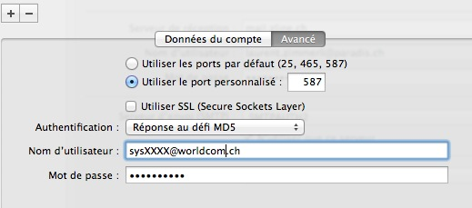 Votre nom d'utilisateur (sysXXXX@worldcom.ch) et votre mot de passe xDSL vous permettent d'authentifier l'envoi de courriel. Le serveur SMTP doit être mail.worldcom.ch sur le port 587 Cette option figure dans les paramètres supplémentaires. Voir sous "serveur sortant" ou "serveur de messagerie pour courrier sortant" ou "authentification SMTP" Exemple dans Outlook §ix101065;101064.jpg;1faf8e3971db8281ee1ef26bf92df411§ Exemple de configuration dans Apple Mail Liens apparentés Articles apparentés Catégories / sous-catégories |
