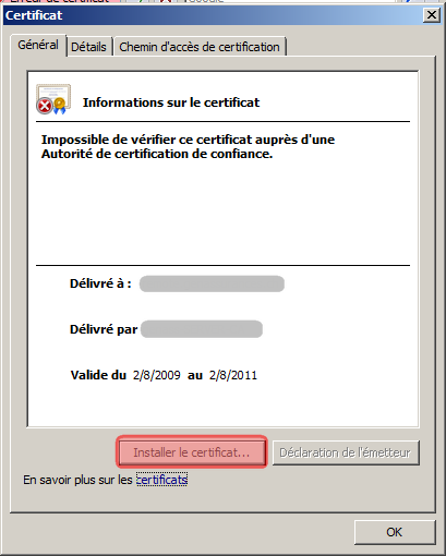 5. Cliquer sur afficher les certificat 6. Cliquer sur Installer le certificat 7. Cliquer sur Suivant -> Mettre le point dans "Placer tous les certificats dans le magasin suivant", cliquer sur parcourir, sélectionner "Autorités de certification racines de confiance", OK, -> suivant -> Terminer 8. Un message de confimation apparait -> cliquer sur ok 9. Cliquer sur ok de la fenêtre certificat |