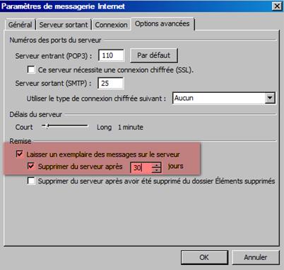 Si vous gérez votre compte avec le protocole POP3, c'est le votre logiciel de gestion de la messagerie électronique (Outlook, Thunderbird, etc.) qui donne l'ordre au serveur de conserver ou de détruire les courriels téléchargés. Comment régler ceci ? Via les paramètres avancés de votre compte de messagerie. Au delà de la période concernée, votre logiciel de messagerie enverra l'ordre d'effacement des mails sur le serveur. Par exemple, avec Outlook : Il faut ajouter une croix ici : Outils > paramètre du compte > modifier > paramètres supplémentaires > options avancées |