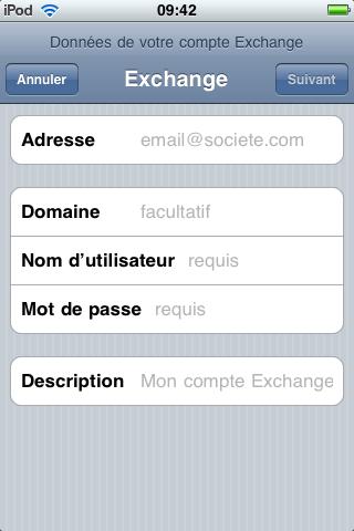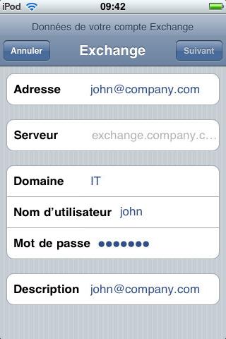 Réglages > Mail, Contacts, Calendrier > Ajouter un compte > Microsoft Exchange2. Saisissez les informations dans les champs ci-dessous, puis touchez
