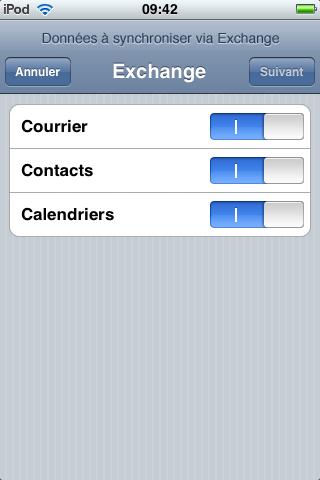 4. Choisissez le contenu que vous souhaitez synchroniser : Mail, Contacts, Calendrier. Touchez