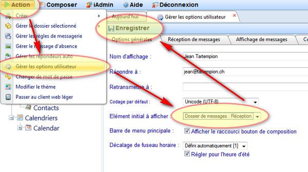 Voici comment procéder pour définir un élément par défaut (par exemple la boite de réception des mails) sur votre compte du webmail. |
